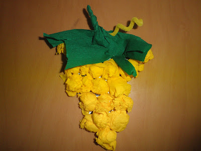 Σε κίτρινο χαρτί Α4 ζωγραφίστε ένα τσαμπί σταφύλι με απλούς κύκλους. Κόψτε αρκετά κομμάτια από το κίτρινο χαρτί γκοφρέ, σε ίσα μεγέθη. Το κάθε κομμάτι θα το τσαλακώσετε για να το κάνετε μια μπάλα που θα είναι η κάθε ρώγα του σταφυλιού. Τα παιδάκια σας θα διασκεδάσουν πολύ να τσαλακώνουν τις μπαλίτσες χαρτιού!